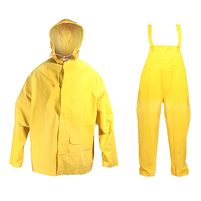 "Three piece rain suit made of PVC/polyester fabric including a detachable hood, corduroy collar and storm-fly front jacket with snap buttons. Two flapped jacket pockets with snap buttons. Snap buttons are non-conductive, non-corroding. Ventilated cape back and underarms. Bib-styled suspender pants."