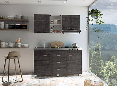 Integral kitchen, includes counter with well on the left, 7 swing doors, 3 drawers, metal handles, and a variety of shelves. Elaborated in Wood MDP chipboard, covered with excellent quality melamine sheets, in Gray and White. Its measures are: Upper Cabinet Height: 48 cm Width: 150cm Depth: 31.5cm Lower Module Height: 84.5 cm Width: 150cm Depth: 50cm
