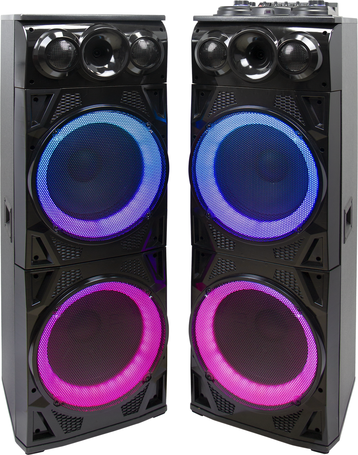 "• TWS, USB, TF, SD Card • FM Stereo Radio • LED On/ Off Switch • Music Spectrum LED Lights • Woofer: 12"" x 2 • Equalizer • Bluetooth • 6 Band Equalizer • X-Bass Control • Remote Control included • Tweeter: Magnet Tweeter"