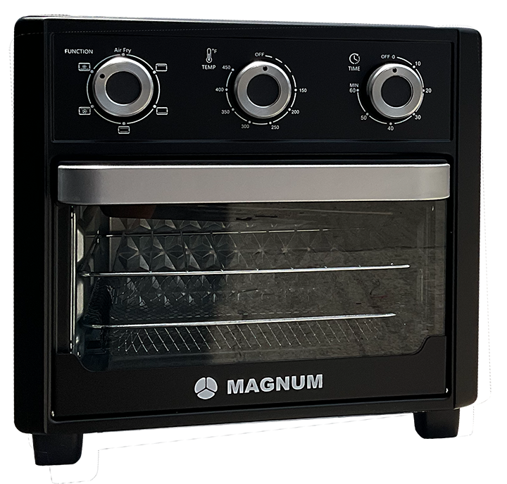 "14L capacity Rated power 1200W Voltage: 110V-120V (60Hz) Single tempered glass door 150o-450oF Adjustable Temperature 60 minute timer with bell ring & Auto shut off 6 Functions (Warm, Broil, Convection & Broil, Toast, Bake) Full accessories: Bake Tray x 1, Bake Rack x 1, Tray Handle x 1, Wire Basket x 1, Crumb Tray x 1 Rapid hot air circulator air fryer technology Dimensions: 16.5"" x 13.8"" x 15.4"""