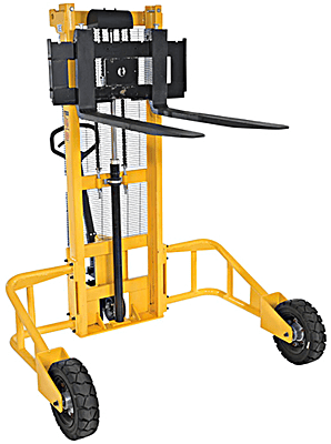 Specifications: Maximum Capacity: 2,000 LBS Fork Lift range: 2-1/8" to 62" 50" Usable Width Fork size: 4"W x 42"L with an adjustable O.D. of from 8⅜" to 33" Manual pump lift handle to lift & lower the load / manual push to move the stacker (2) 15" diameter front tires, (2) 10" diameter rear tires Not recommended for use on a grade Overall size: 64"W x 63"L x 80"H Weight: 1,273 LBS