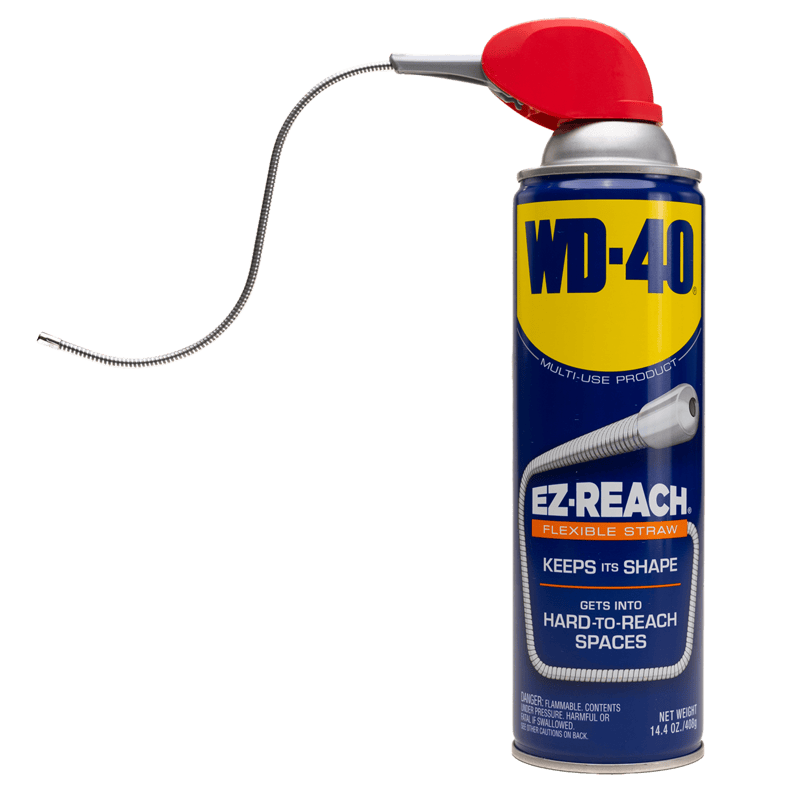 WD-40 Multi-Use Product protects metal from rust and corrosion, penetrates stuck parts, displaces moisture and lubricates almost anything. WD-40 EZ-REACH features an attached 8-inch flexible straw that bends and keeps its shape to get into hard-to-reach places.
