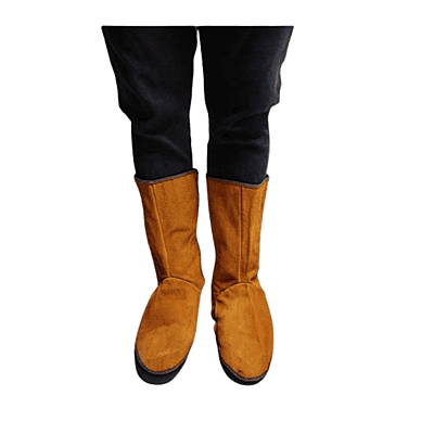 Protective leather foot spats designed to shield footwear and lower legs from sparks, slag, and molten metal during welding.